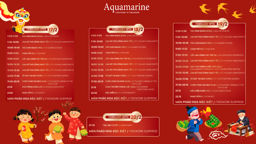 Không gian resort được khoác lên mình sắc xuân rực rỡ với hoa mai, hoa đào, câu đối đỏ và những góc check-in Tết . Du khách có thể tham gia các workshop viết thư pháp, làm đồ thủ công,…cùng nhiều trò chơi dân gian thú vị dành cho cả gia đình. Bên cạnh đó, các đêm tiệc mừng xuân, chương trình biểu diễn nghệ thuật và buffet Tết đặc sắc sẽ mang đến hành trình ẩm thực phong phú, kết hợp tinh hoa món Việt ngày Tết với hương vị quốc tế đặc trưng của Aquamarine resort.